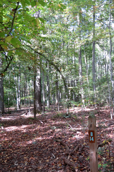 Look past the numbered station post off to the left,look at the Ironwood tree that is curving over the yellow blazed trail about 20 meters ahead,