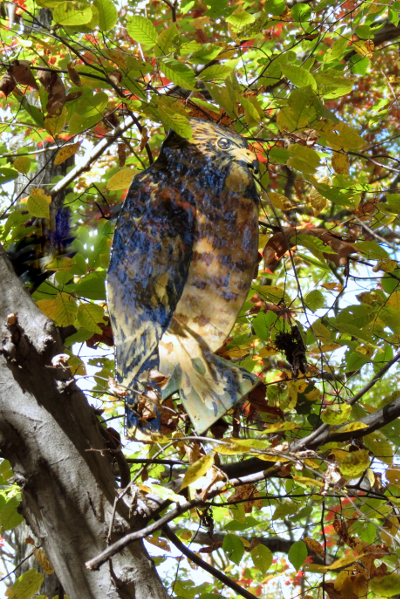 about 5 meters up the curved tree is the Red-shouldered Hawk replica.