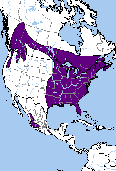 Forested areas, from swamps and riparian areas to uplands. Prefers large blocks of forest-extensive woodlands.
