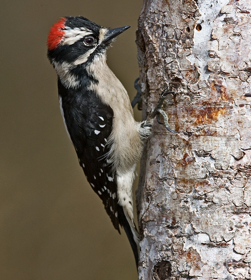 Downy Woodpeckers are small versions of the classic woodpecker body plan. They have a straight, chisel-like bill, blocky head, wide shoulders, and straight-backed posture as they lean away from tree limbs and onto their tail feathers. The bill tends to look smaller for the bird’s size than in other woodpeckers. Downy Woodpeckers give a checkered black-and-white impression. The black upperparts are checked with white on the wings, the head is boldly striped, and the back has a broad white stripe down the center. Males have a small red patch on the back of the head. The outer tail feathers are typically white with a few black spots.