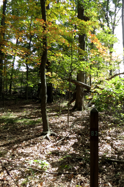 Stand looking straight past the numbered station post,about 20 meters ahead is an Ironwood tree,
