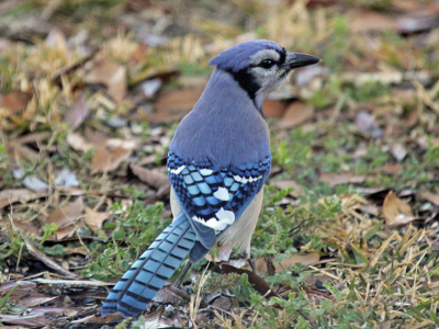 This common, large songbird is familiar to many people, with its perky crest; blue, white, and black plumage. Large crested songbird with broad, rounded tail. Blue Jays are smaller than crows but larger than robins. White or light gray underneath, various shades of blue, black, and white above.