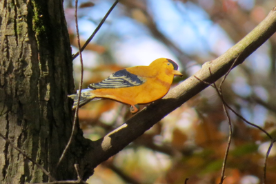the Goldfinch is close to the trunk on that branch.