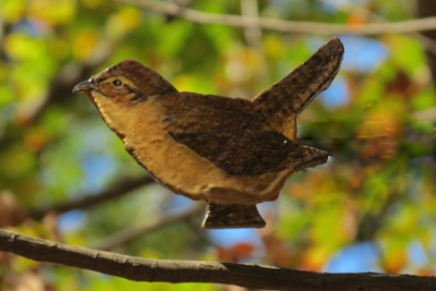 A busy forager in low tree branches and shrubs. You’ll occasionally see these birds flit across openings with steady, level flight, or investigating the ground with quick hops. Male House Wrens start building several nests at once in hopes of persuading a female to mate with him. Pairs typically break up by the end of each nesting season and choose new partners the next year. House Wrens are aggressive. Single males sometimes compete for females even after a pair has begun nesting. In about half of these contests the outsider succeeds in displacing his rival, at which point he usually discards any existing eggs or nestlings and begins a new family with the female.